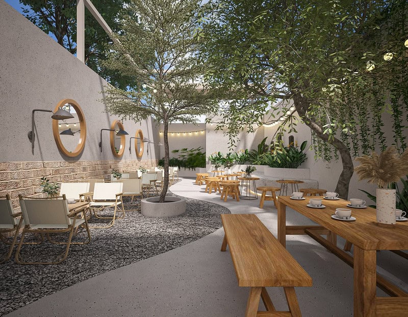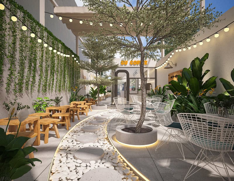 - Quán cafe sân vườn tối giản – tập trung vào cây xanh và ánh sáng tự nhiên.