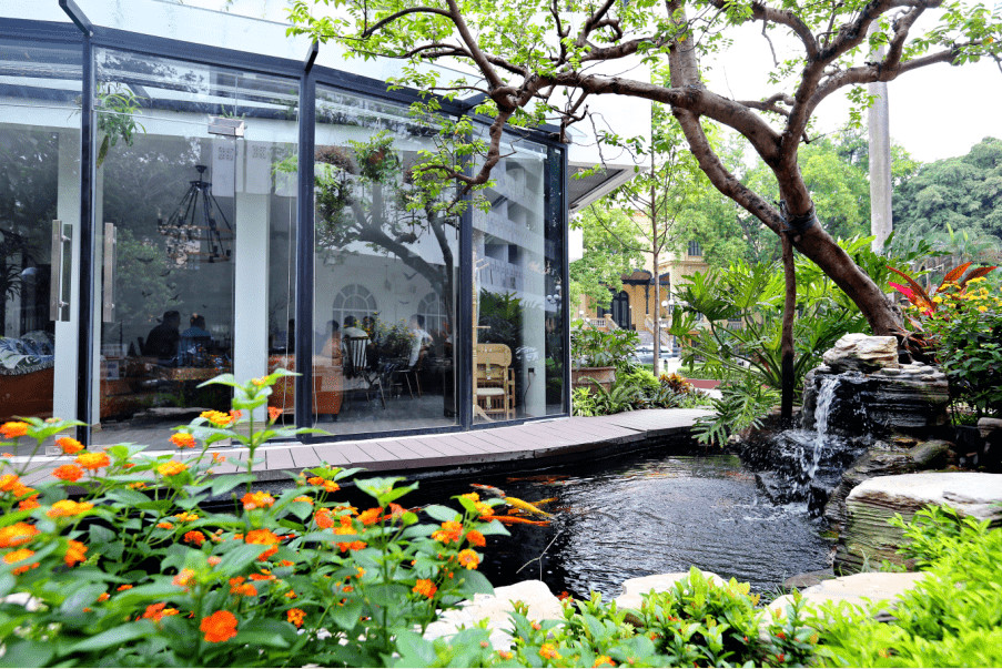 - Quán cafe sân vườn có hồ cá Koi – điểm nhấn phong thủy độc đáo.