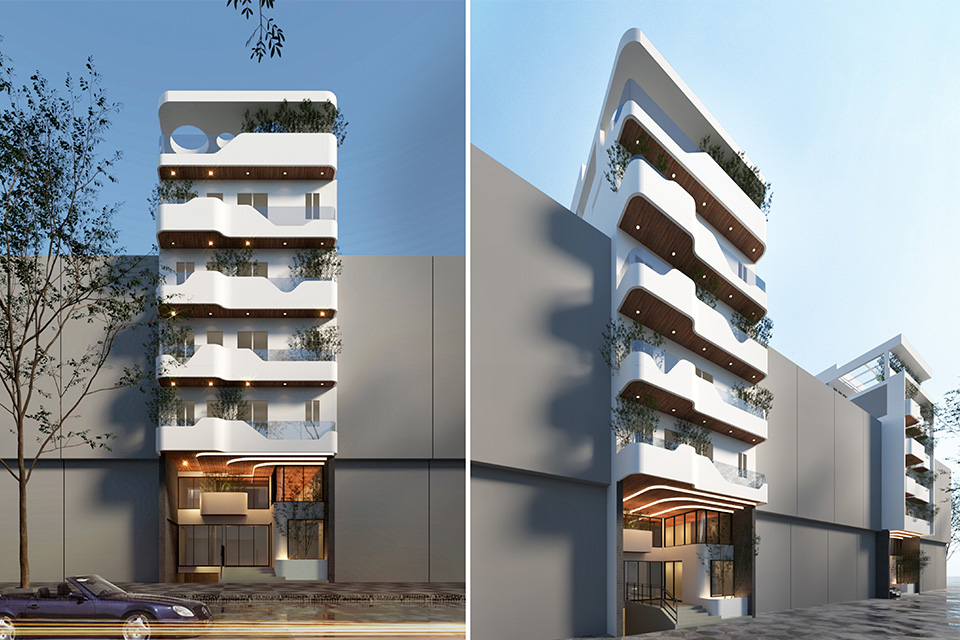 Lớp ngoài là lam che nắng hoặc cây xanh, lớp trong là hệ cửa kính — giúp công trình mát mẻ, tiết kiệm điện năng và tạo hiệu ứng kiến trúc ấn tượng.