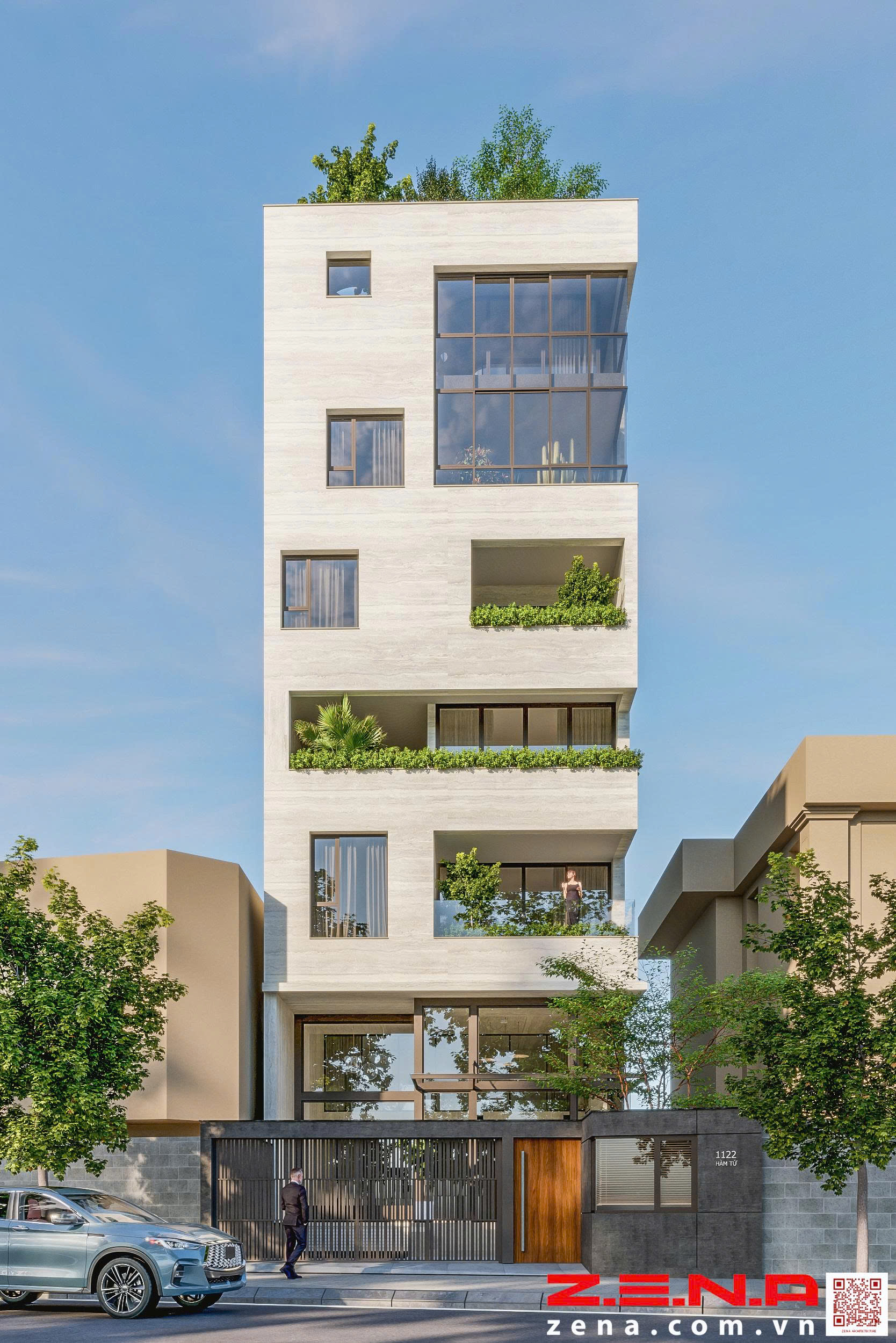 - Mẫu nhà 4 tầng hiện đại: tầng trệt văn phòng – tầng trên sinh hoạt – sân thượng làm vườn.